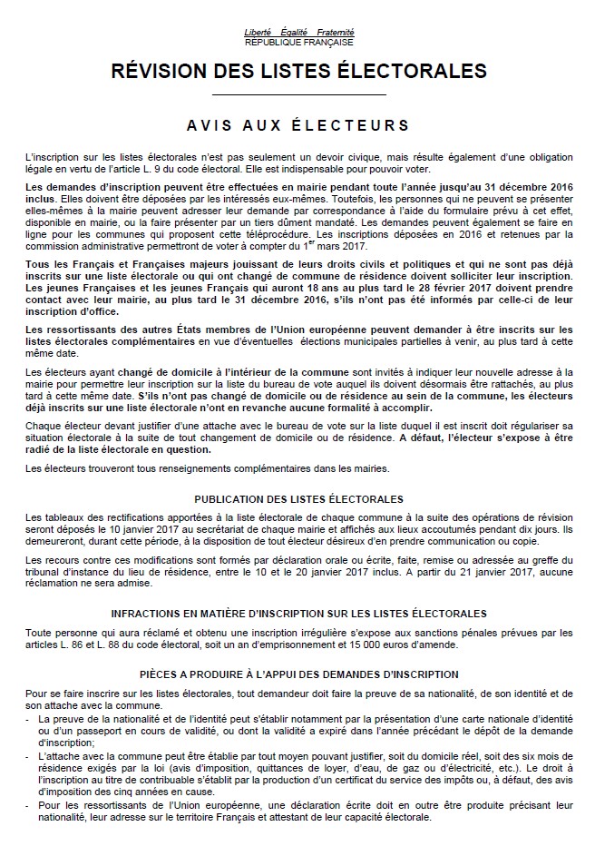 Avis aux électeurs. Les demandes d’inscription sur les listes électorales peuvent être effectuées en mairie jusqu’au vendredi 14 mai inclus. Pour plus d’informations, cliquez ci-dessous : decret_2021-483_-2.pdf Vous pouvez télécharger l’imprimé de demande d’inscription en cliquant sur le lien suivant : http://www.lacadieredazur.com/-DOSSIERS-D-INSCRIPTION-.html